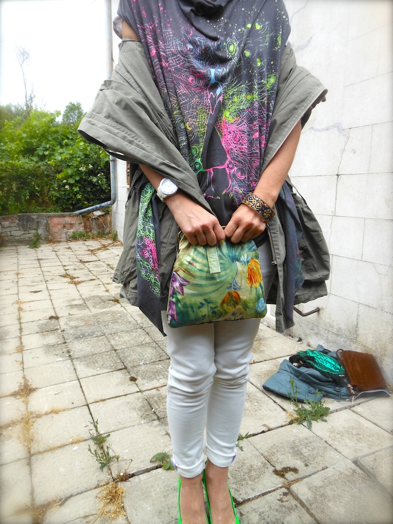 Hi guys! Here the outfit i've used in the weekend for going out. The inspiration is tropical nature enriched by fluo accent and sartorial white denim. The protagonists of this outfit are my new tee and foulard by III Monkeys, i like very much the peacock graphic and the flu print on the dark grey base. As accessories my new green shoes and my vintage clutch. In the bottom of the post i also show you some of my favorite little bags. All of them are old. The little gilet and parka are old too. I've added a vintage bangle and a plastic watch.
