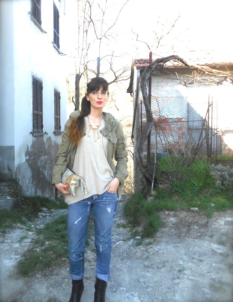 Ciao a tutti! qui vi mostro un altro look indossato per un uscita durante una giornata soleggiata della scorsa settimana ;) anche oggi è così ;) quindi spero di aver modo di fare nuove foto ;) magari riproducendo uno dei look del weekend visto che pioveva…in quel caso, prima che piovesse, la mia idea outfit si basava su mini parka, maglioncino in cashmire, jeans, ankle boots, e infine tocchi dorati per la collana con chiavi di Jo Ventura ed una mini clutch dorata e vintage presa al mercatino a Milano quasi 2 anni fa credo.Cosa ne dite? vi piacciono questi accessori dorati? Come indossate voi bijoux o borse "golden"?