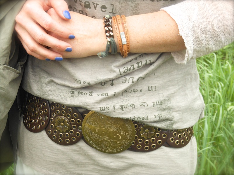 sovrapponendolo a pantaloni skinny, sopra il parka, sotto stivaletti con zeppa, e pochissimi bijoux essenziali in tema con i colori, collana Perlopiu' e braccialetti, uno in lycra camo di Hug Me e l'altro con una preghiera stampata di Spirito Libero ;)da sempre, adoro sia i rosari che altre creazioni moda che si rifanno alla religione con preghiere e croci L'unico punto di colore vivace era lo smalto, blu,